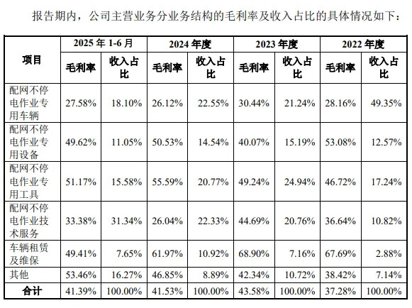 从收入构成来看,公司传统核心业务配网不停电专用车辆销售收入从2022年的2.07亿元下降至2024年的8937.47万元,占比由49.35%降至22.55%,2025年上半年进一步降至18.10%。与此同时,车辆租赁及维保业务收入从1208.03万元攀升至4326.39万元。